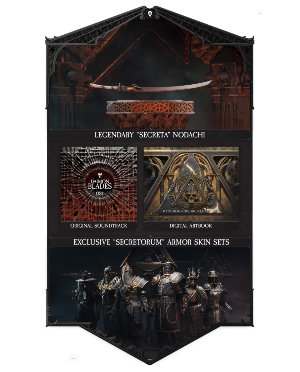 Aquellos que apoyen la compra de Daimon Blades durante el Early Access serán recompensados con el paquete exclusivo «Secreta Secretorum». Incluye skins exclusivas para armas y armaduras que son una oda al título original de Streumon, E.Y.E: Divine Cybermancy, así como un libro de arte digital (en formato PDF) y la banda sonora original (en formatos MP3 y sin pérdida). Aunque el libro de arte y la banda sonora estarán disponibles para su compra una vez que el juego se lance en la versión 1.0, ambas skins solo estarán disponibles durante el Early Access.