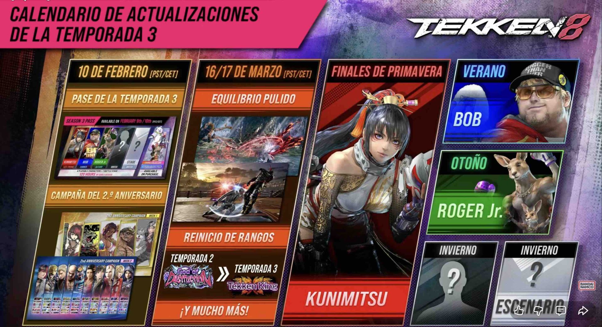 El pase de la temporada 3 estará disponible para su compra a partir del 10 de febrero de 2026, y Kunimitsu, el primer personaje de la temporada 3, llegará a finales de la primavera de 2026.