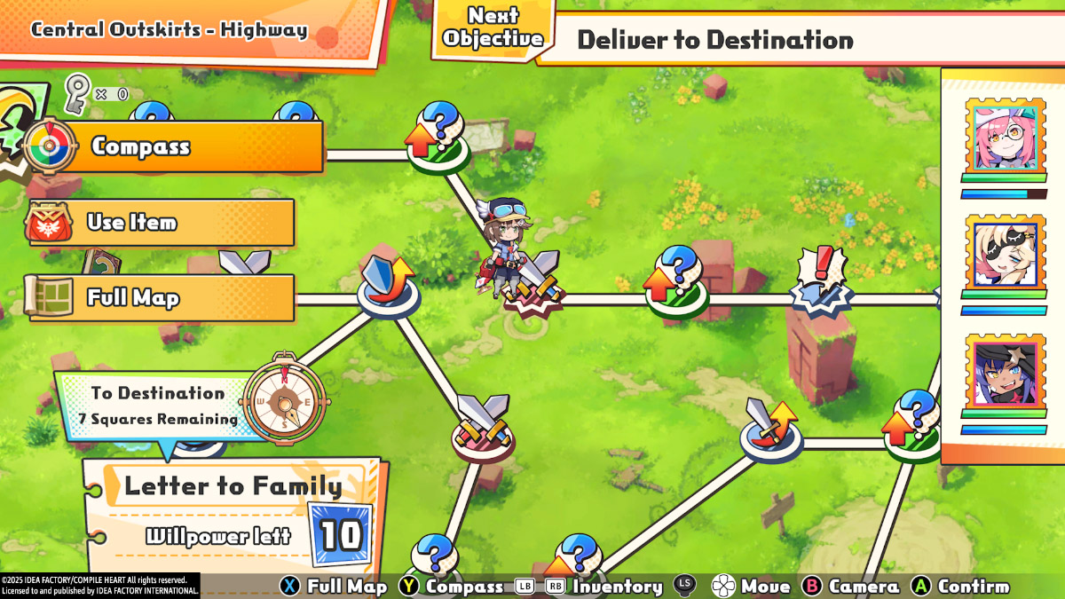 Las rutas se desarrollan en un mapa tipo tablero donde una ruleta determina tu siguiente espacio. Tiendas, paquetes especiales y encuentros con jefes aparecen a medida que te acercas al punto de entrega.