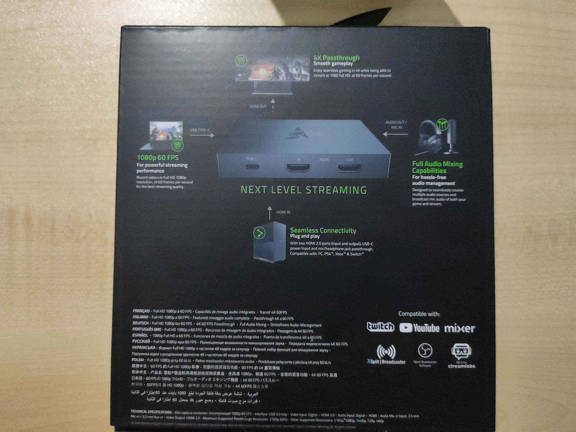 La caja de la capturadora se mantiene en la temática general de Razer, tamaño justo y necesario, muy compactado todo y con toques negros y verdes. Tenemos por delante una imagen de la capturadora, mientras que por detrás sus características más clave, de las cuales hablaremos más adelante.