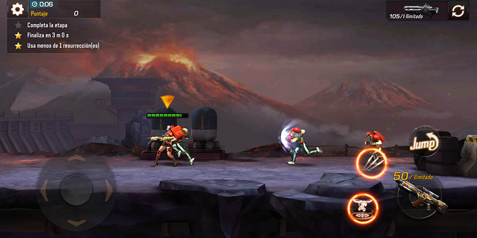 En nuestro recorrido por los escenarios enfrentaremos robots, soldados, zombis, y alienígenas. Con pequeñas secciones de plataformas, moveremos nuestro personaje a través de una palanca digital en la parte inferior izquierda y dispararemos presionando el botón digital de disparo en la parte inferior derecha.