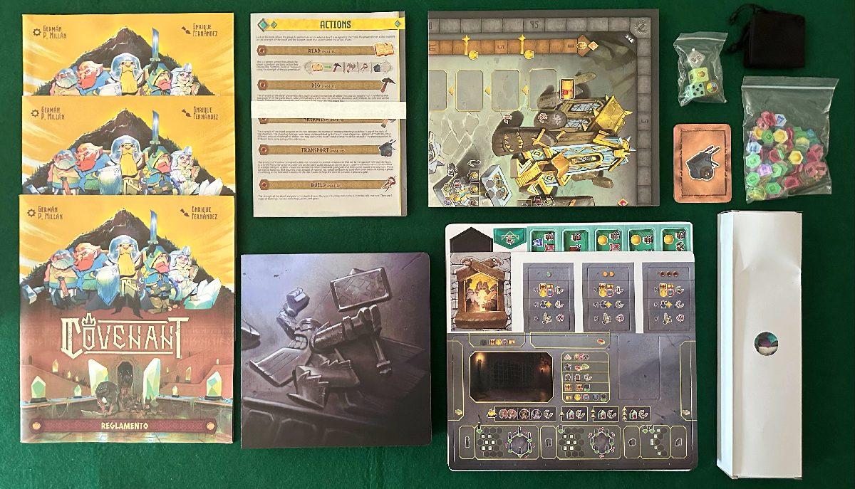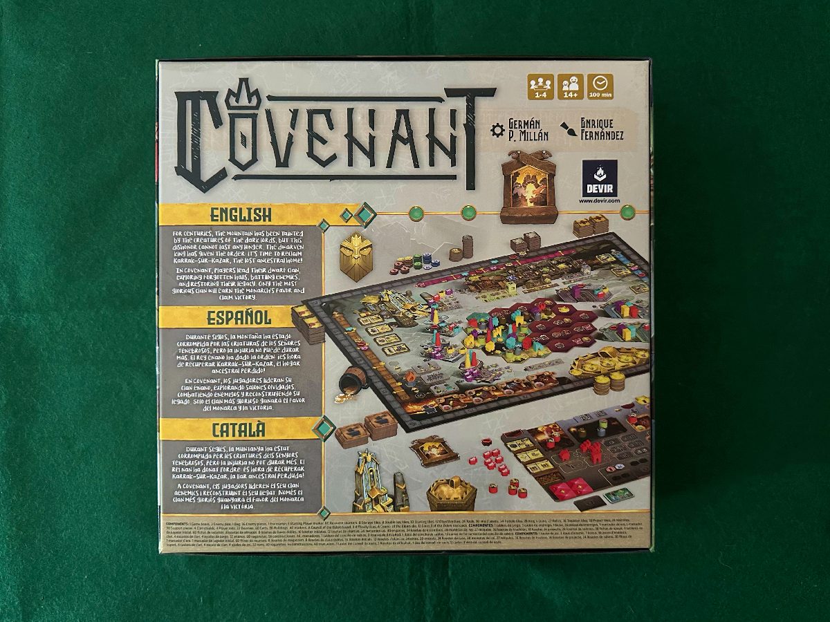 A grandes rasgos, COVENANT es un juego de colocación de trabajadores y mayorías para 1 a 4 jugadores, recomendado a partir de 14 años, con partidas de una duración aproximada de media hora en adelante. En él, los jugadores deberán gestionar sus clanes de enanos a lo largo de tres eras, realizando acciones y acumulando Puntos de Gloria para ganarse el reconocimiento del Rey de los Enanos.