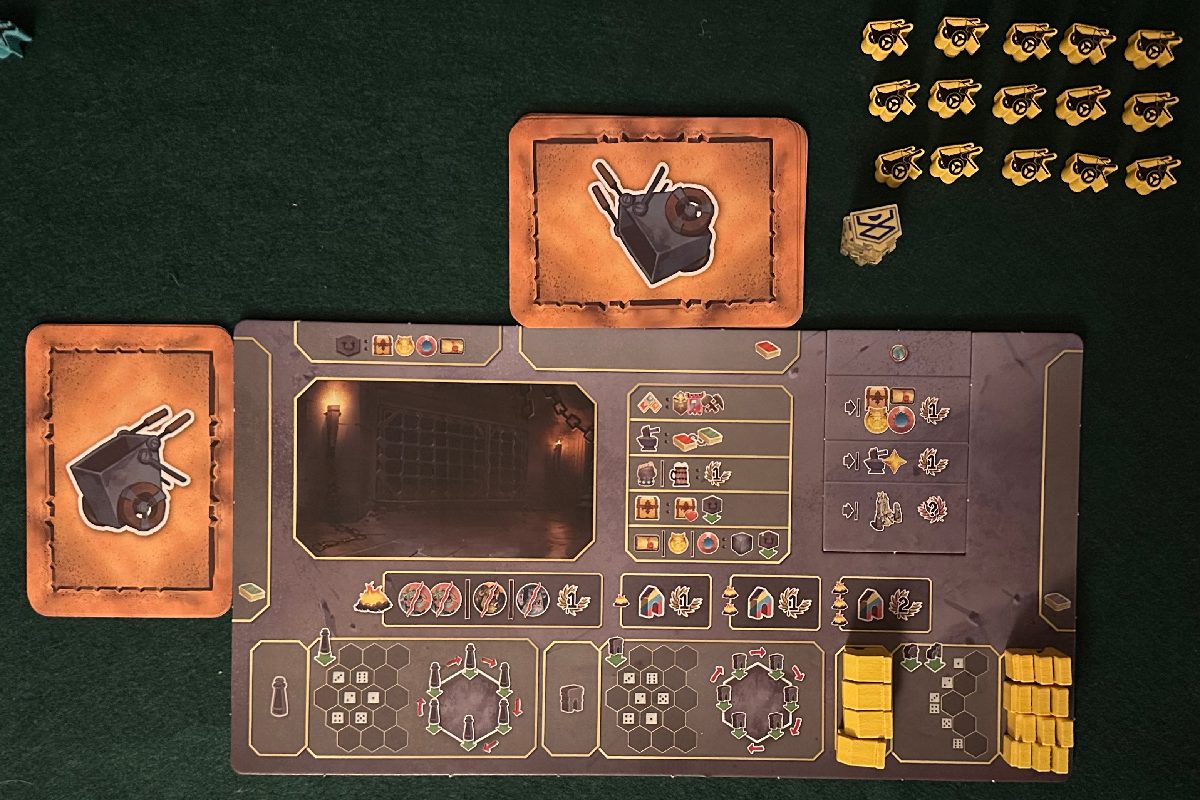 Una vez realizada esta selección, se prepara el tablero del Concilio de Sabios. En primer lugar, se elige una de las tres losetas de dificultad disponibles, que determina la cantidad de Puntos de Gloria que obtendrá el Concilio de Sabios al final de la partida. Uno de los aspectos más interesantes de este modo es que el autómata no utiliza fichas de enanos. En su lugar, se emplean cartas de herramienta, que se barajan y se organizan formando un mazo con una carta de cada tipo, colocado a la izquierda del tablero, y el resto de cartas situadas en la parte superior.