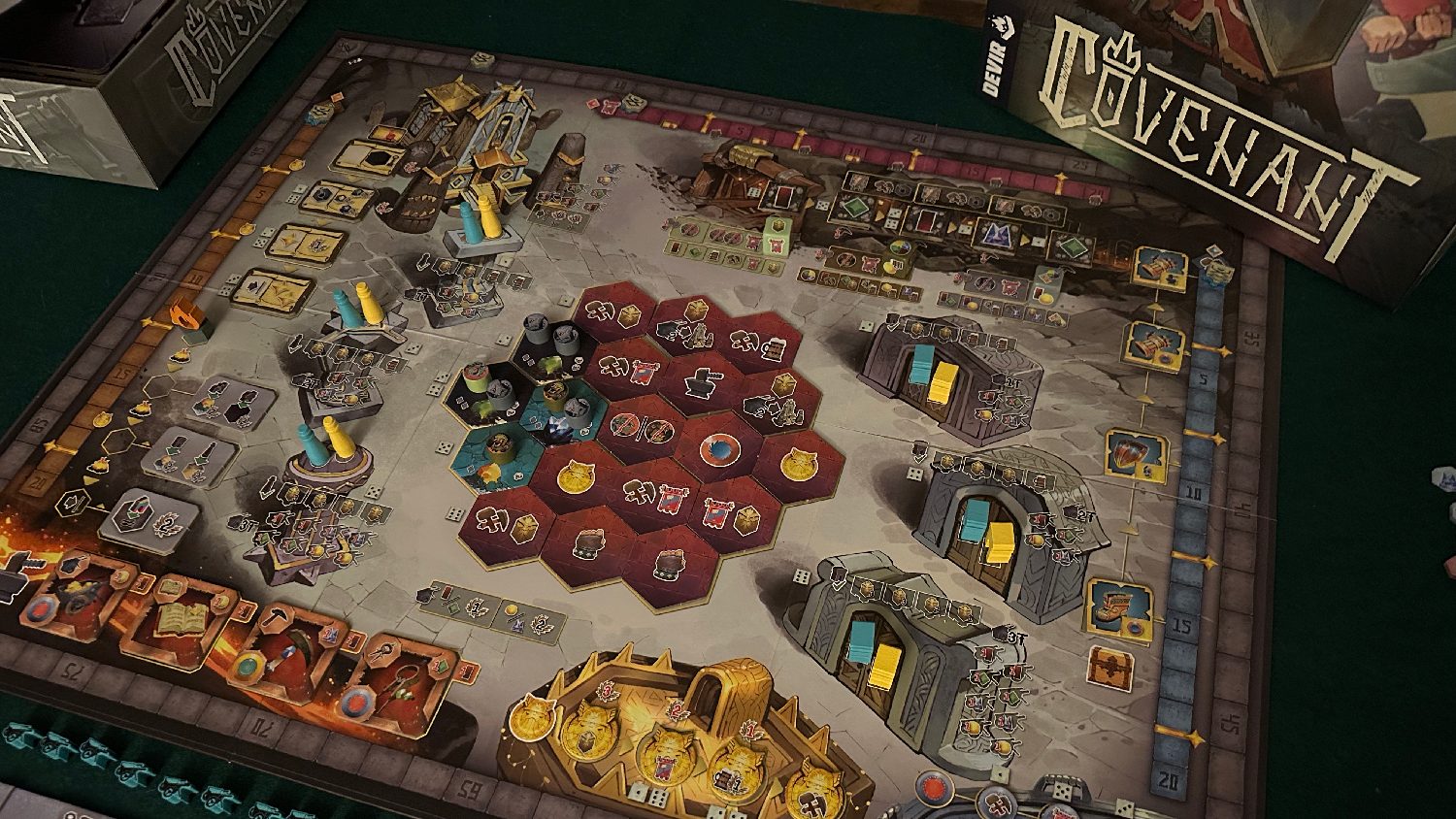 Presentado al público asistente durante el SPIEL Essen 2025, celebrado en Essen (Alemania), COVENANT se convirtió rápidamente en uno de los títulos más comentados del evento, llamando especialmente la atención de los aficionados a los eurogames de colocación de trabajadores. Una propuesta ambiciosa que combina profundidad estratégica y una fuerte identidad temática.COVENANT, diseñado por Germán P. Millán, autor de títulos tan reconocidos como Bitoku, Sabika o Men-Nefer, e ilustrado por Enrique Fernández, nos sumerge en un mundo de fantasía en el que asumimos el papel de líderes de un clan enano que acude al llamamiento del Rey Enano, para recuperar la montaña sagrada de Karrak-Sür-Kazar de la invasión de los Señores Tenebrosos. Para lograrlo, los clanes deberán limpiar los salones de la montaña de criaturas malignas y reconstruir su antiguo hogar.