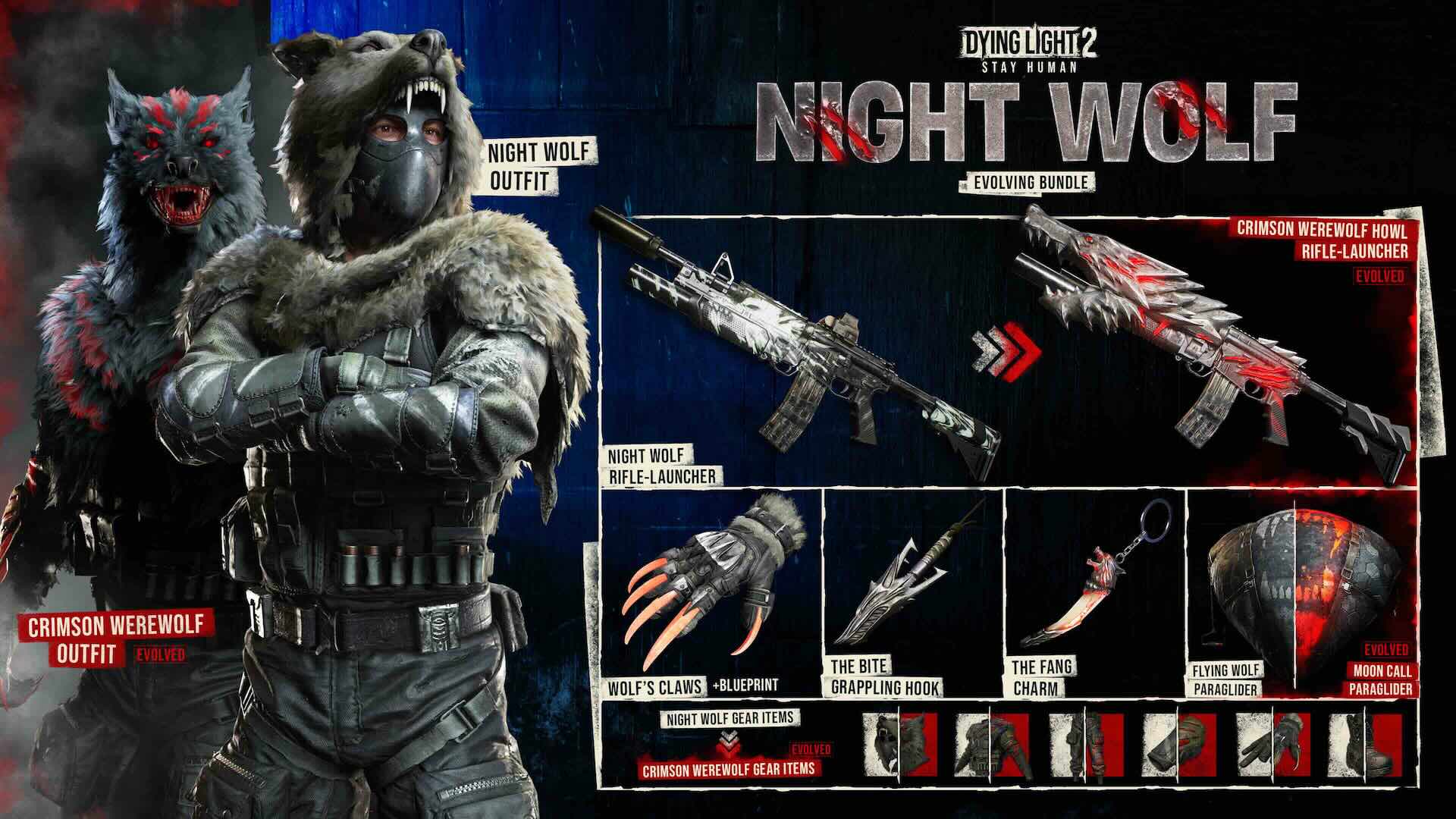 El primer lote de este tipo es el Night Wolf Evolving Bundle, que evoluciona hasta convertirse en el conjunto Crimson Werewolf a medida que avancemos a través de una cadena de misiones dividida en cuatro partes. De este modo, podremos obtener dos versiones de un potente rifle, un atuendo, seis piezas de equipo y un diseño para el parapente. El lote también incluye el arma cuerpo a cuerpo Wolf’s Claws y una variante exclusiva del gancho.