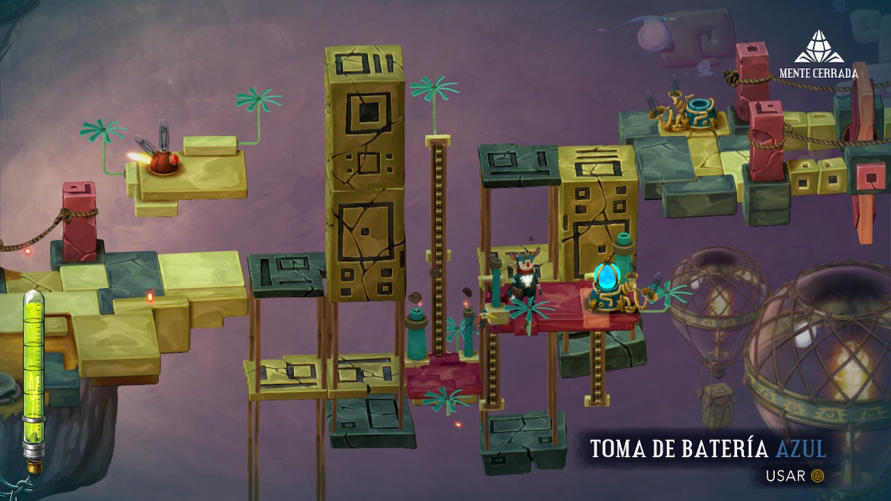 Estamos ante un plataformero con vista aérea y acertijos de entorno, si bien el progreso es bastante lineal en el mundo de la mente, puedo decir que los acertijos son la mar de intuitivos y divertidos de superar, en donde constantemente tendremos que estar adivinando el orden correcto de activación de los interruptores que nos ayudarán a desbloquear nuestro camino al activar plataformas o luces que limpien el avance.