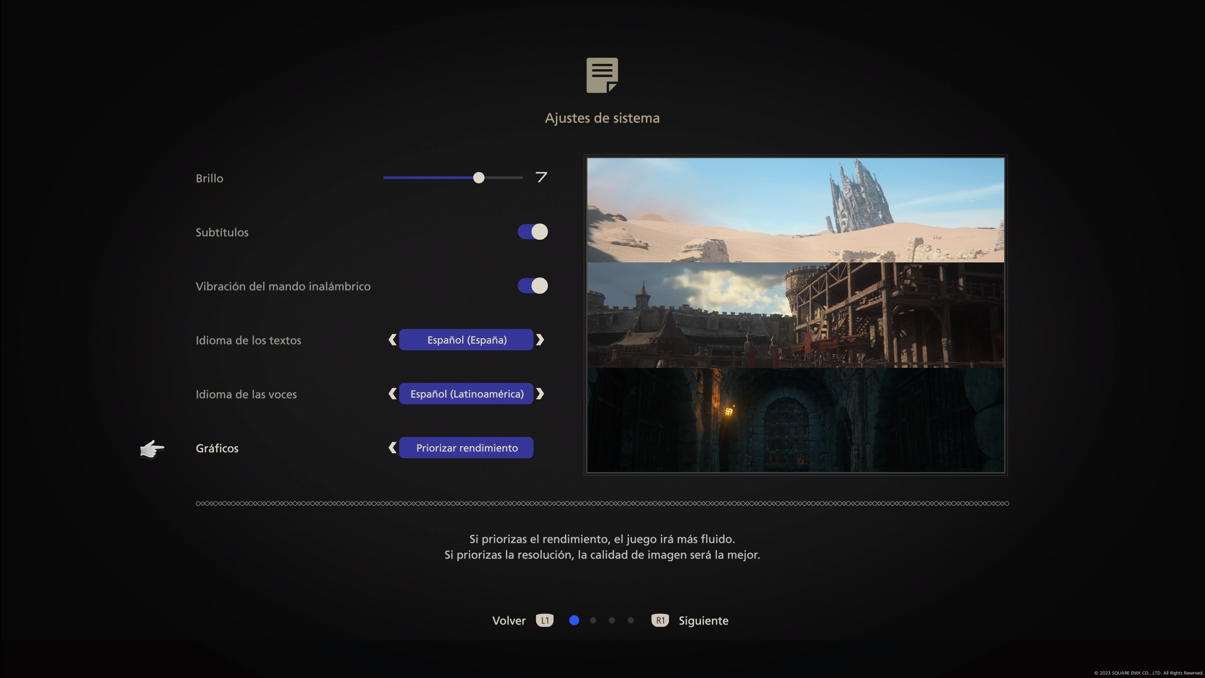 El juego nos ofrece dos modos gráficos. Rendimiento y resolución, en el primero corre a 60 fotogramas por segundo a una resolución dinámica de 1440p, mientras que en modo resolución se ve a 2160p a 30fps en la PlayStation 5. En cinemáticas corre a 30fps sin importar el modo.