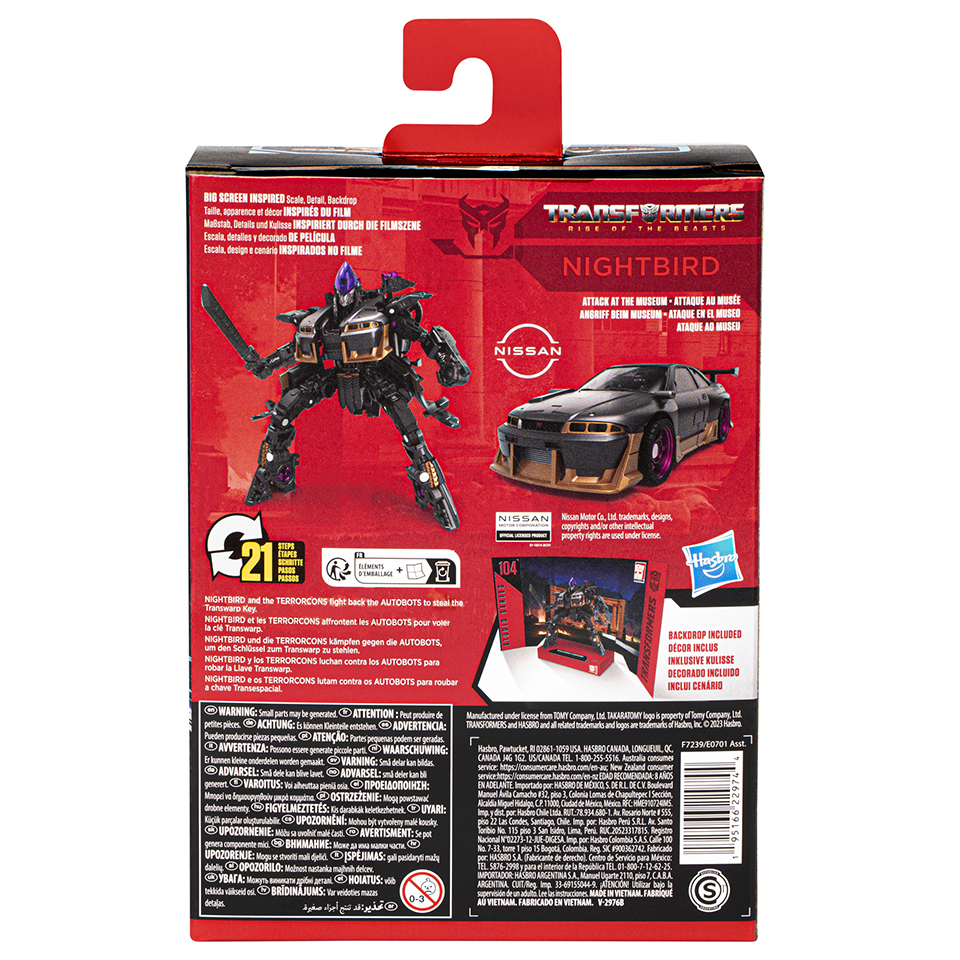 Otra emocionante adición a la colección es la figura Nightbird Deluxe Class de “Transformers: El despertar de las bestias”. Esta figura se puede transformar de un robot a un modo Nissan Skyline GTR R33 en 21 pasos y viene con un fondo removible que representa la escena del Ataque en el museo. Nightbird es una opción perfecta para los fanáticos que buscan figuras de acción divertidas y versátiles.