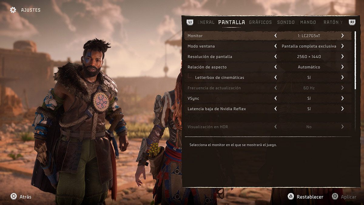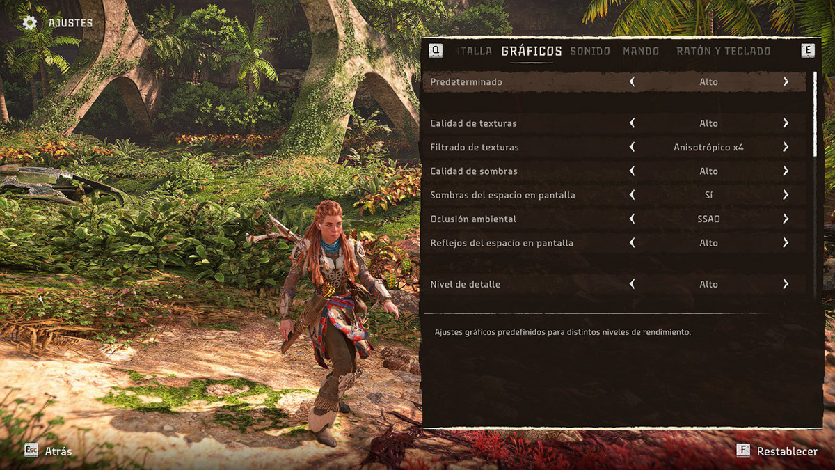 Cabe mencionar que podemos enchufar el mando DualSense para una compatibilidad total con respuesta háptica, gatillos adaptativos y los efectos sonoros en el altavoz. Curiosamente se ha eliminado la opción de copiloto en las funciones de accesibilidad que se destacaba en consola, en razón que podemos controlar a Aloy por medio del ratón y teclado al simultáneo del mando.