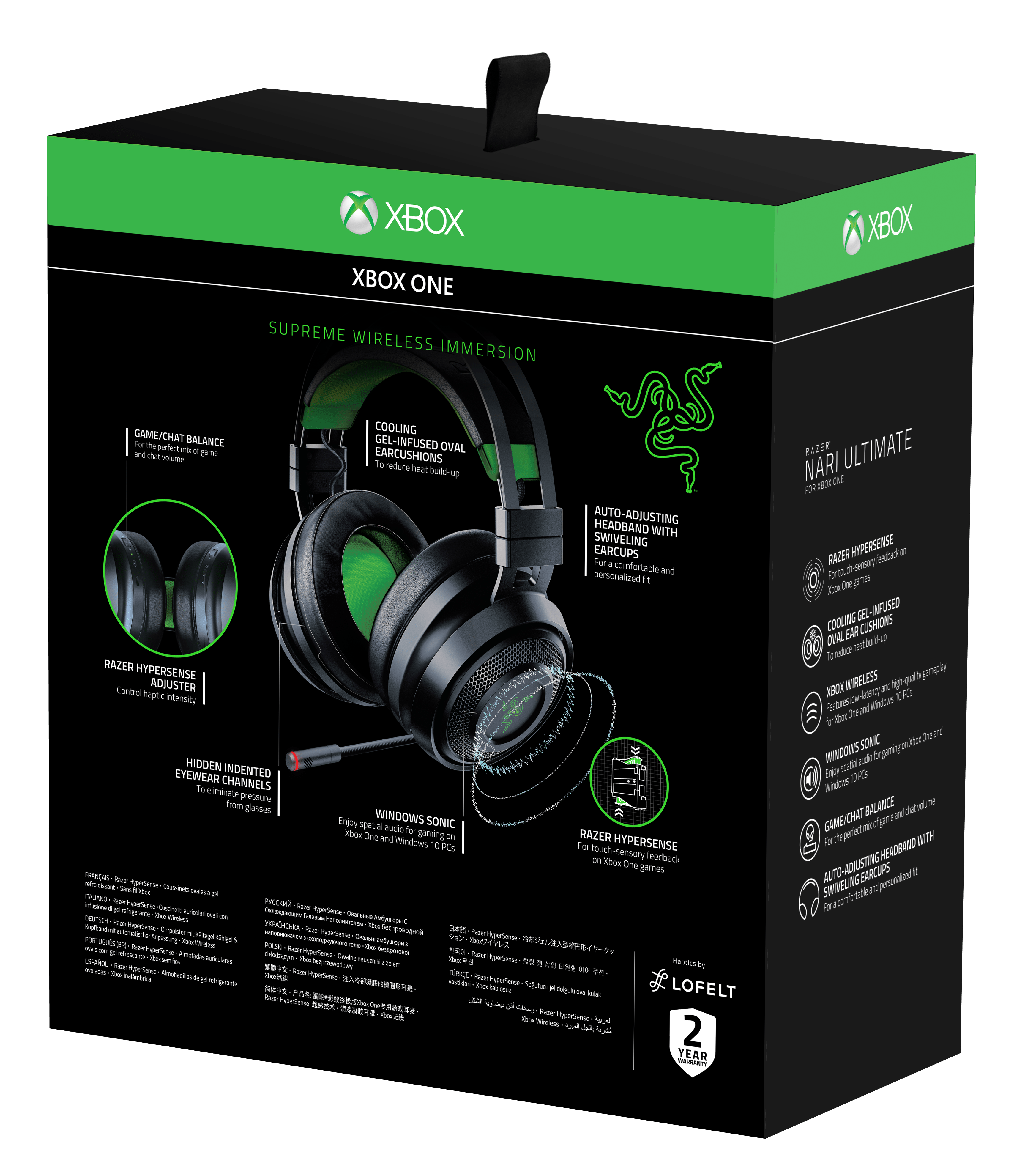 Diseñado originalmente para PC, el Razer Nari Ultimate se lanzó en Septiembre de 2018 y recibió un gran reconocimiento al presentar la tecnología Razer HyperSense, llevando la experiencia de inmersión en videojuegos a nuevas cotas. Con el Razer Nari Ultimate para Xbox One, Razer ahora trae la experiencia a la galardonada consola Xbox One.