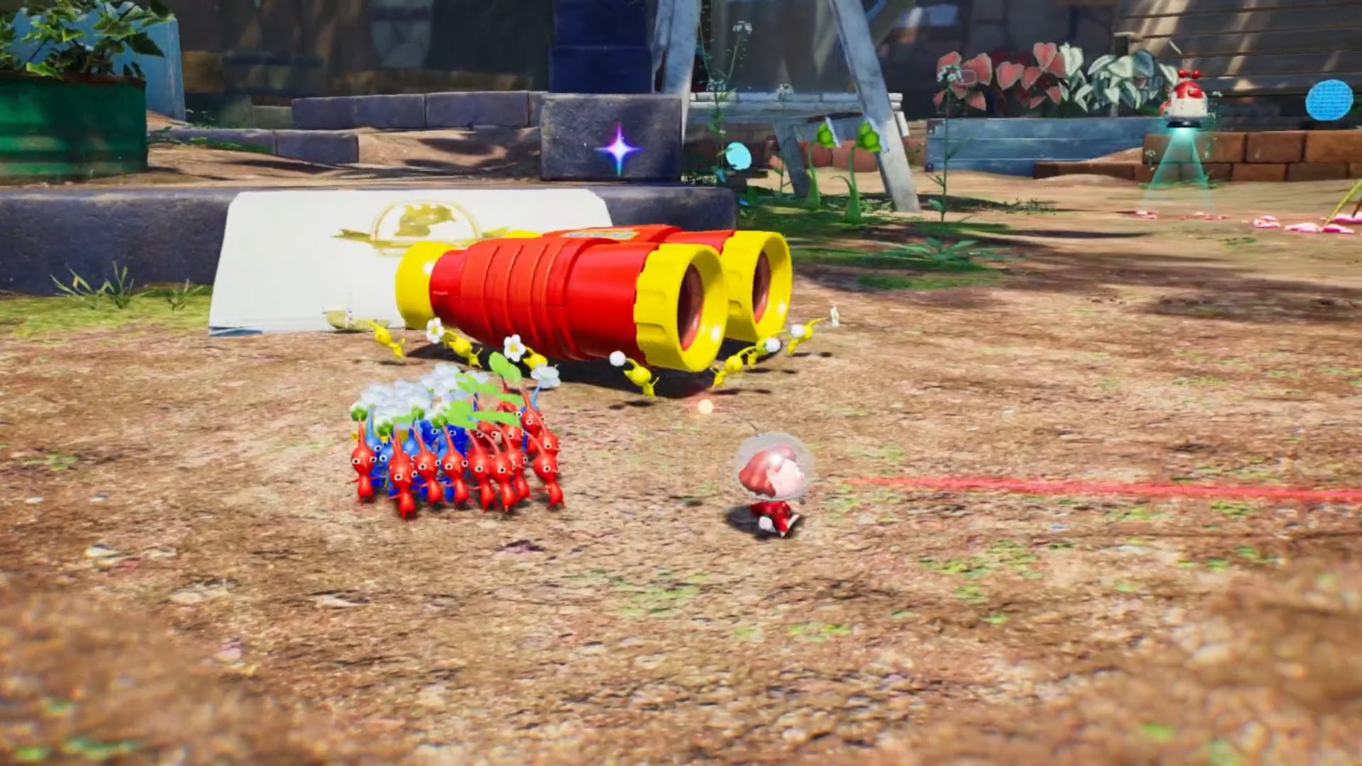 ¡También obtienes un perro espacial! Oatchi puede ayudarte con cosas como romper obstáculos y llevar a Pikmin a lo largo de tu aventura. Con los minúsculos Pikmin y un canino capaz a cuestas, ¡ningún desafío es demasiado grande o pequeño!