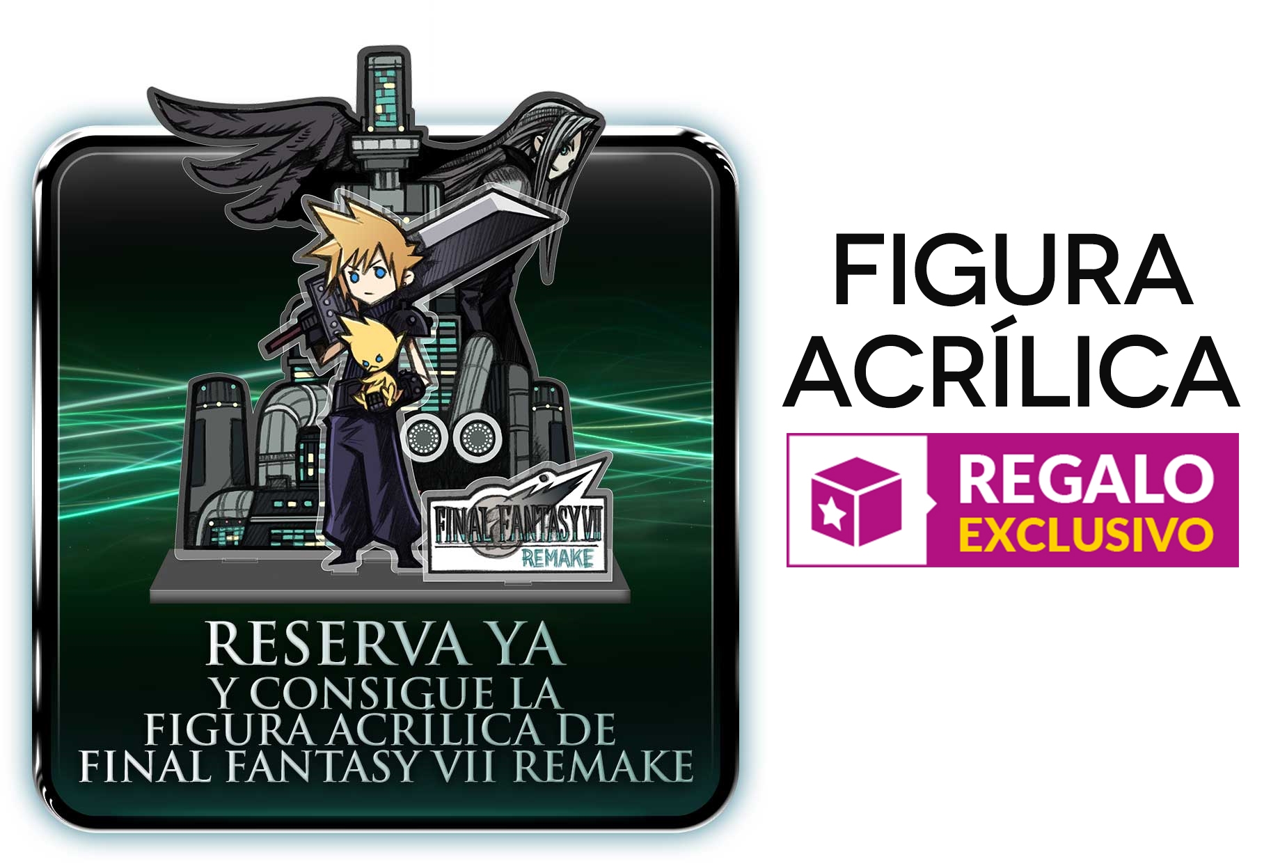 Solo reservando FINAL FANTASY VII REMAKE en GAME, vas a poder llevarte una figura acrílica de Cloud, ¡es una pasada! La figura tiene un estilo “Kawaii” y muestra a Cloud con un chocobo en brazos frente al Edificio Shinra, con Sephirot detrás. Además, también vas a poder llevarte con tu reserva el DLC “Materia de invocación de Chocobito”.