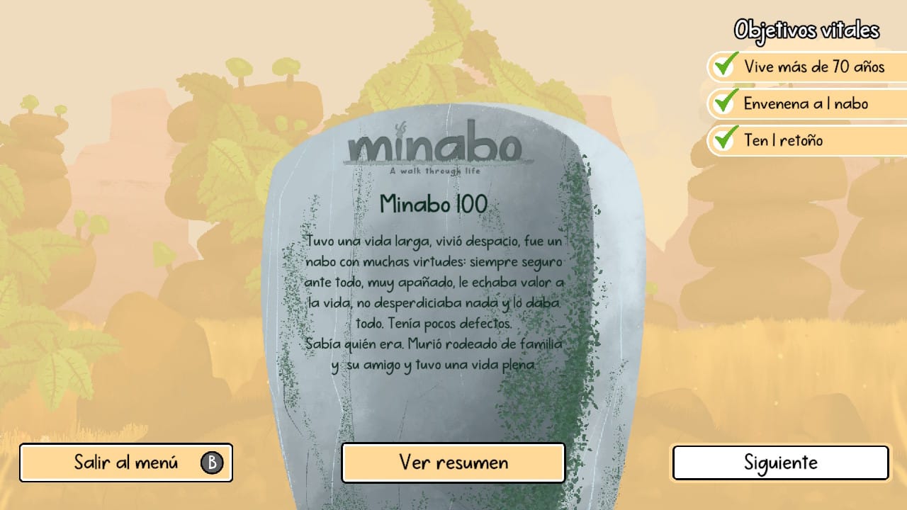 En nuestra vida, todo depende de nosotros y de cómo queramos avanzar. Así, Minabo nos deja a nosotros decidir eso. Si queremos ir corriendo o despacio, disfrutando de los años. Si preferimos saludar a todo lo que nos crucemos o preferimos avanzar en solitario… todo depende de nosotros. El juego en ningún momento nos obliga a nada. Nosotros somos los que decidimos sobre nuestra propia vida.