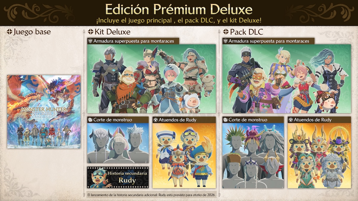 La Edición Deluxe incluye el juego completo y el Kit Deluxe que contiene una historia secundaria adicional: Rudy, cuyo lanzamiento está previsto en otoño de 2026 y un Set de atuendos especiales con armaduras superpuestas para los compañeros, atuendos adicionales para Rudy y opciones de cabello para el personaje del jugador. La Edición Premium Deluxe contiene todo el contenido de la Edición Deluxe, además de un paquete DLC cosmético especial que incluye armaduras superpuestas adicionales para compañeros, opciones para el cabello y atuendos para Rudy, que también se podrán comprar por separado.