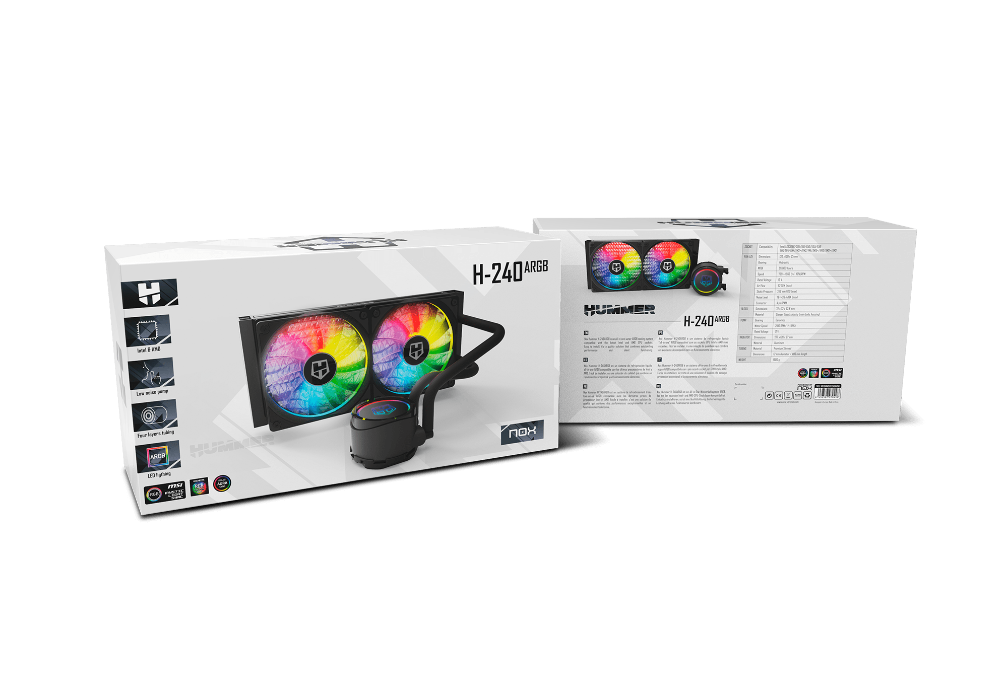 Hummer H-240 ARGB posee un sistema de iluminación LED ARGB de hasta 7 colores compatible con las tecnologías de sincronización de los principales fabricantes de placas base. Así, podrás tanto personalizar su iluminación como sincronizar sus colores con los de tu equipo.