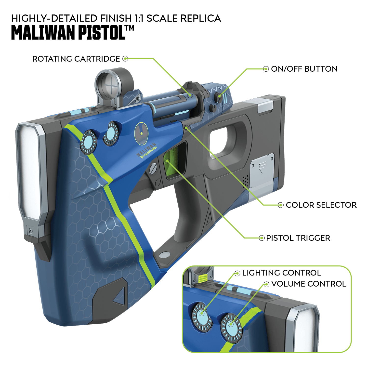 Una de las armas más raras y poderosas encontradas en el juego, esta increíble edición especial de “Maliwan Pistol” ha sido traída a la vida con todo su esplendor. Siendo una réplica a escala 1: 1, la replica Maliwan cuenta con interruptores que funcionan y un cartucho de munición giratorio que aumenta la velocidad a medida que se presiona el gatillo para simular el uso real. Además, la replica Maliwan incluye luces y efectos de sonido sacados directamente de Borderlands 3. Los fans pueden controlar el brillo de las luces y el volumen del sonido con solo girar un dial, así como elegir entre cinco configuraciones de daño elemental diferentes presionando un solo botón.