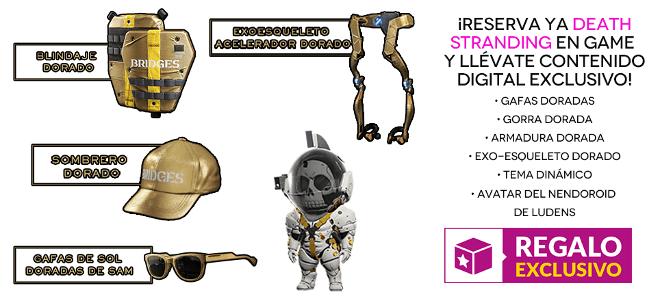 - DLC Exclusivo GAME en la versión en formato físico, y que incluye el siguiente contenido cosmético adicional para el juego: gafas doradas, gorra dorada, armadura dorada, exo-esqueleto dorado, tema dinámico para tu PS4 y avatar del Nendoroid de Ludens para tu perfil de PSN.
