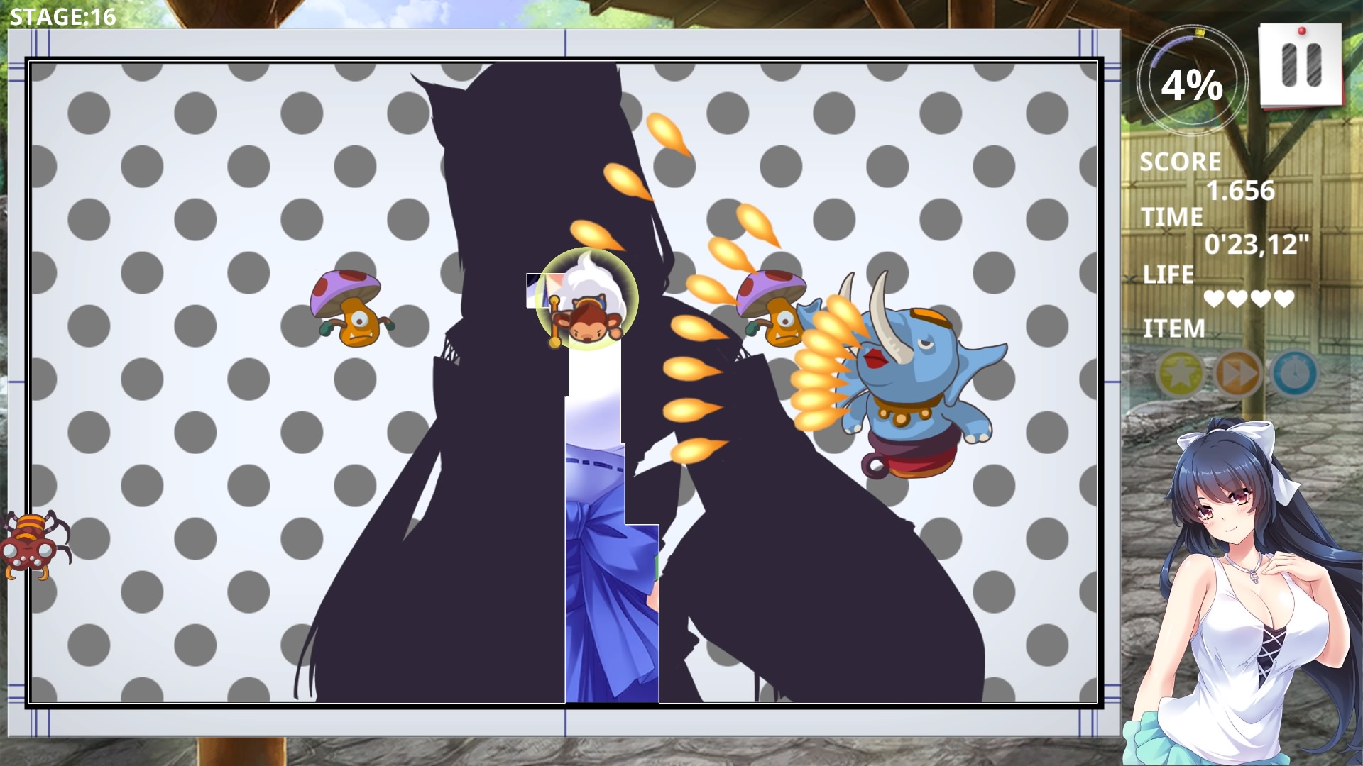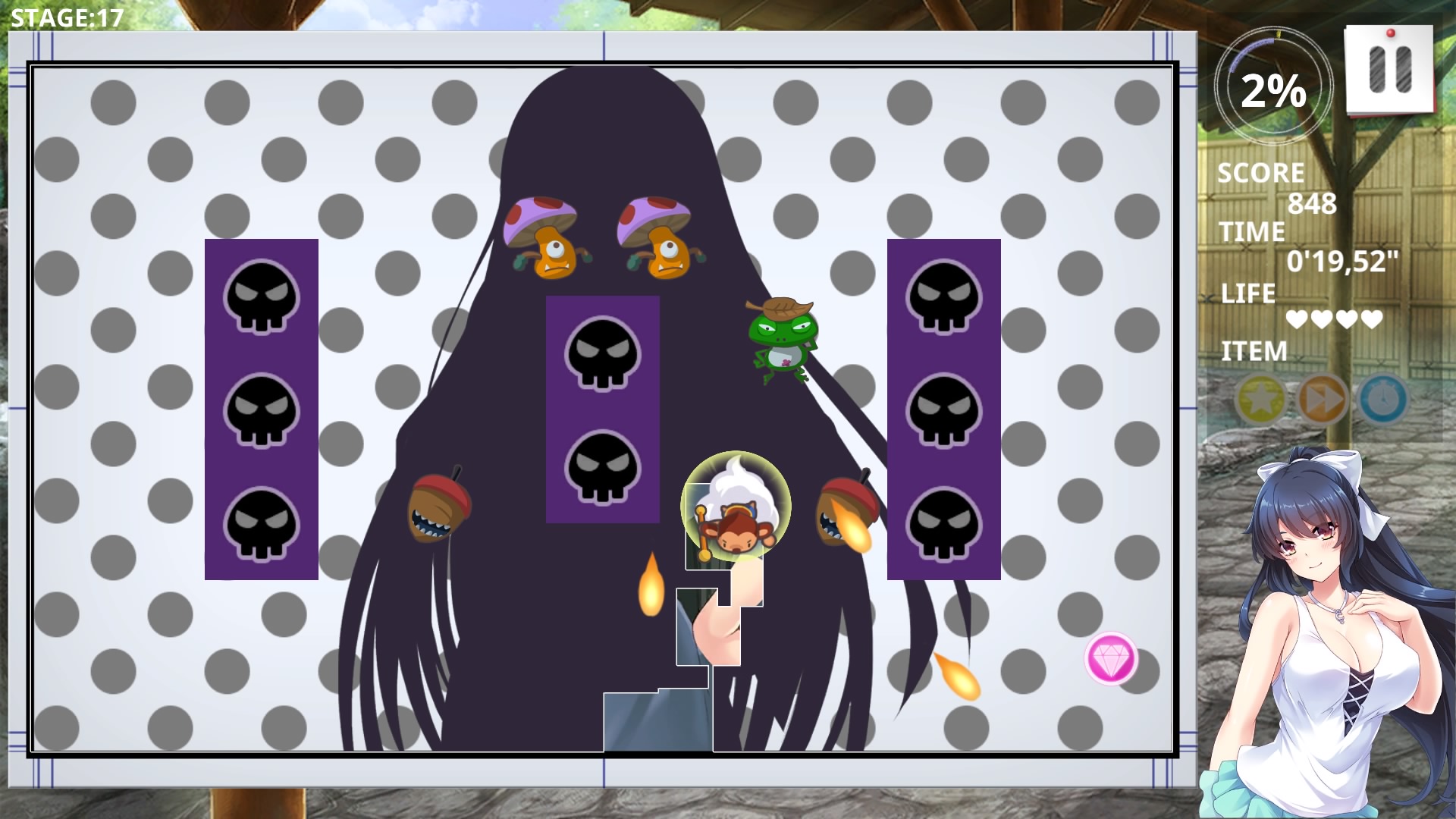 Pretty Girls Panic! Plus cuenta con 40 niveles divididos entre 22 bellas waifus, que conforme superamos, la dificultad irá incrementando a un ritmo disfrutable. Naturalmente, las diferentes criaturas tienen la intención de proteger la modestia de las doncellas del juego. Los niveles iniciales, nos lanzan un puñado de bellotas dentadas rebotadoras, tambores mágicos, más adelante todo se complica con fantasmas, serpientes, hongos que disparan, y arañas que siguen nuestro rastro por los bordes e incluso una elefanta mítica que nos dispararán proyectiles.