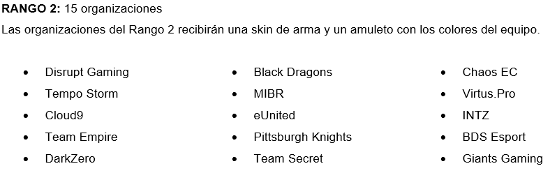 Siguiendo un proceso de selección minucioso con la ayuda de una tercera parte independiente, los 42 equipos seleccionados han sido distribuidos en los rangos que aparecen abajo. Las organizaciones del programa R6 SHARE serán evaluadas cada tres meses y clasificadas respecto a otras organizaciones de su rango, según una serie de criterios: el rendimiento de sus elementos en el juego, el número de espectadores de sus partidos, el apoyo ofrecido a sus jugadores y los resultados de sus comunicaciones relacionadas con Rainbow Six. Los rangos se ajustarán una vez al año a partir de agosto de 2021, y las organizaciones promocionarán o descenderán a diferentes rangos para reflejar con mayor precisión su desempeño en Rainbow Six Siege. Los rangos y los puestos determinarán el nivel de apoyo que recibirá cada organización, así como la parte que obtendrá de la Bolsa de Rendimiento.