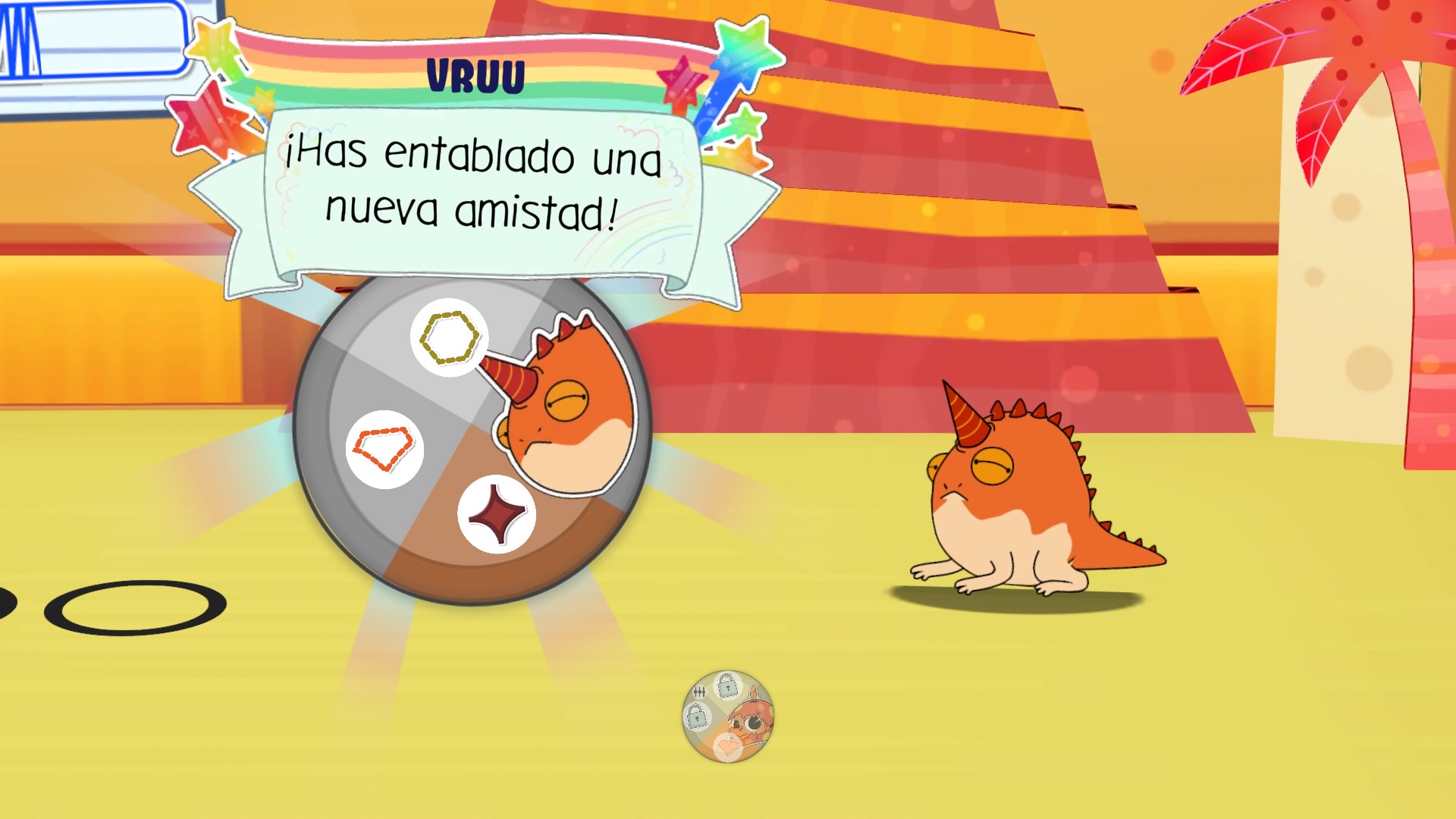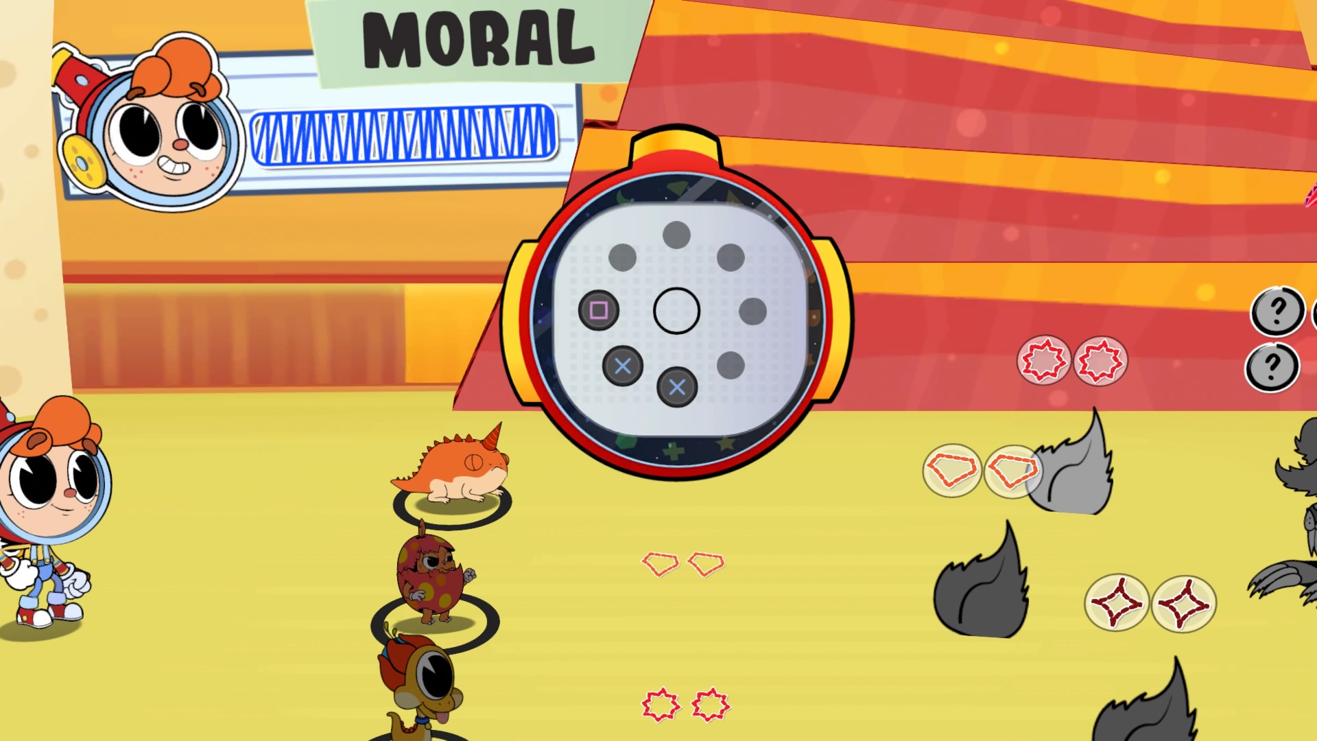 Una vez que seleccionamos a las criaturas de apoyo para el turno, tendremos que completar de forma exitosa una serie de mini-juegos para determinar el éxito del ‘ataque’ o ¿argumento? Si los símbolos que hayamos elegido de nuestros compañeros coinciden con los del rival, nuestro oponente recuperará el color. Una vez que sus símbolos recuperen el color termina la confrontación.