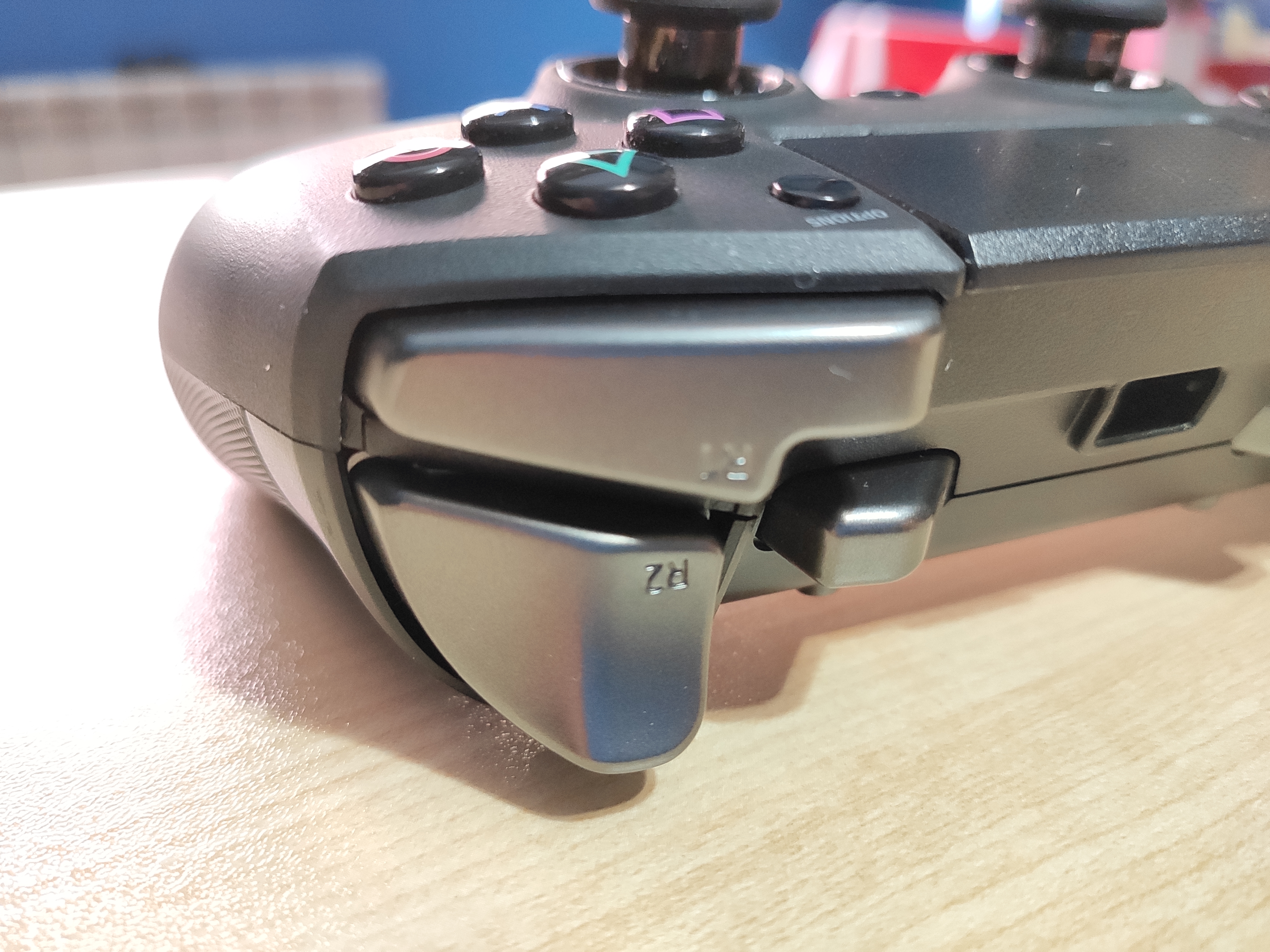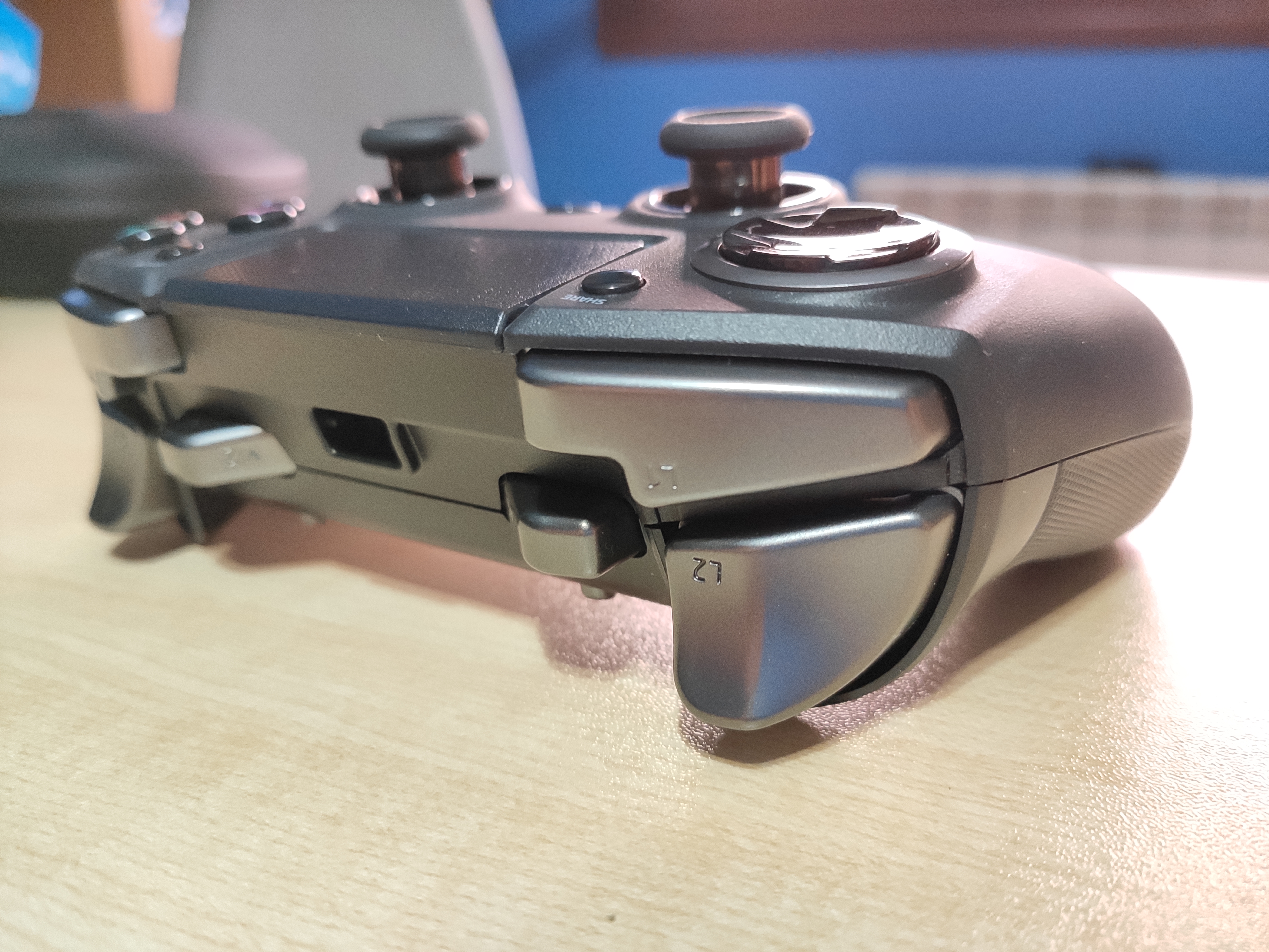 Respecto a los botones extra, tenemos 2 palancas por detrás y 2 botones más entre L1/L2 y R1/R2, además en los gatillos se puede acortar la distancia de activación gracias a un pequeño pestillo que solo hay que mover, ganando ventaja sobre todo en shooters.