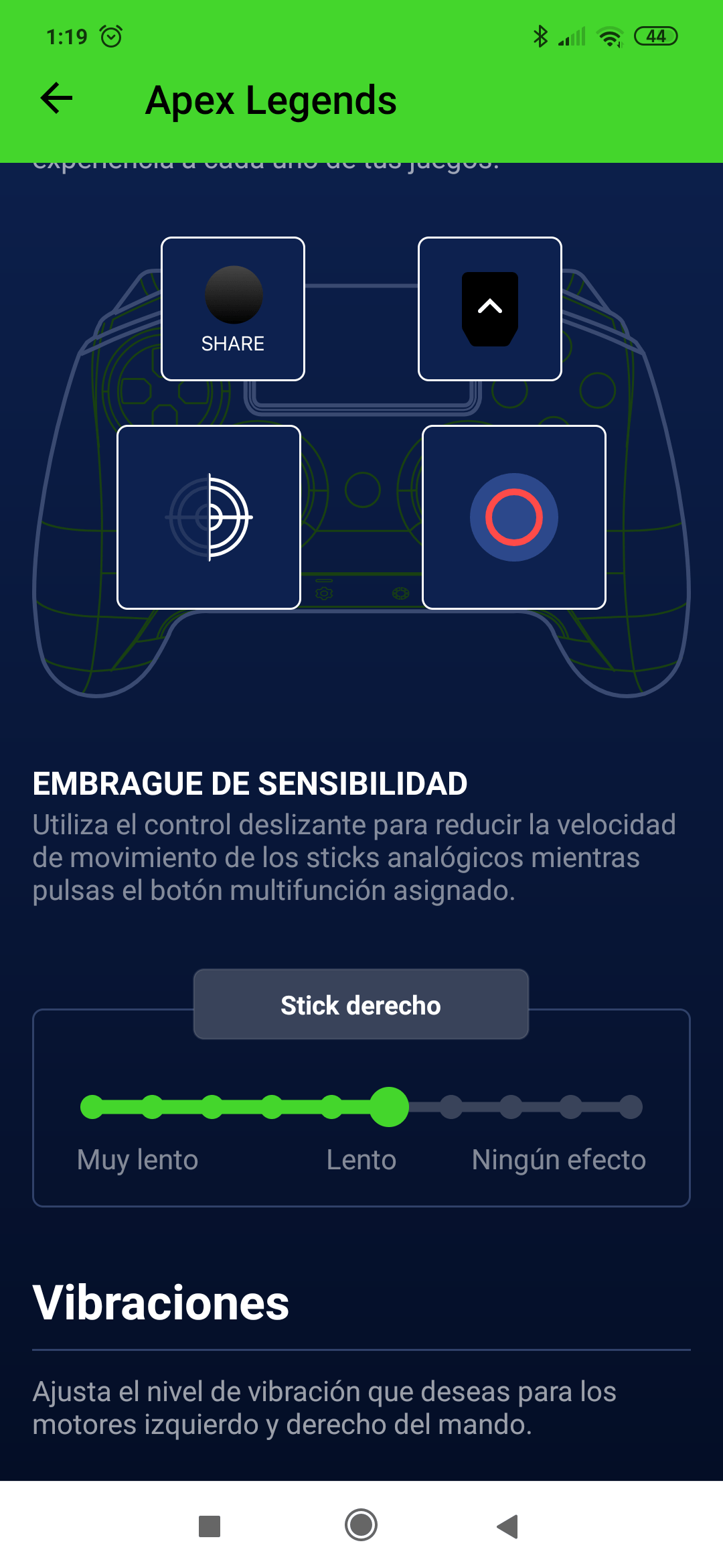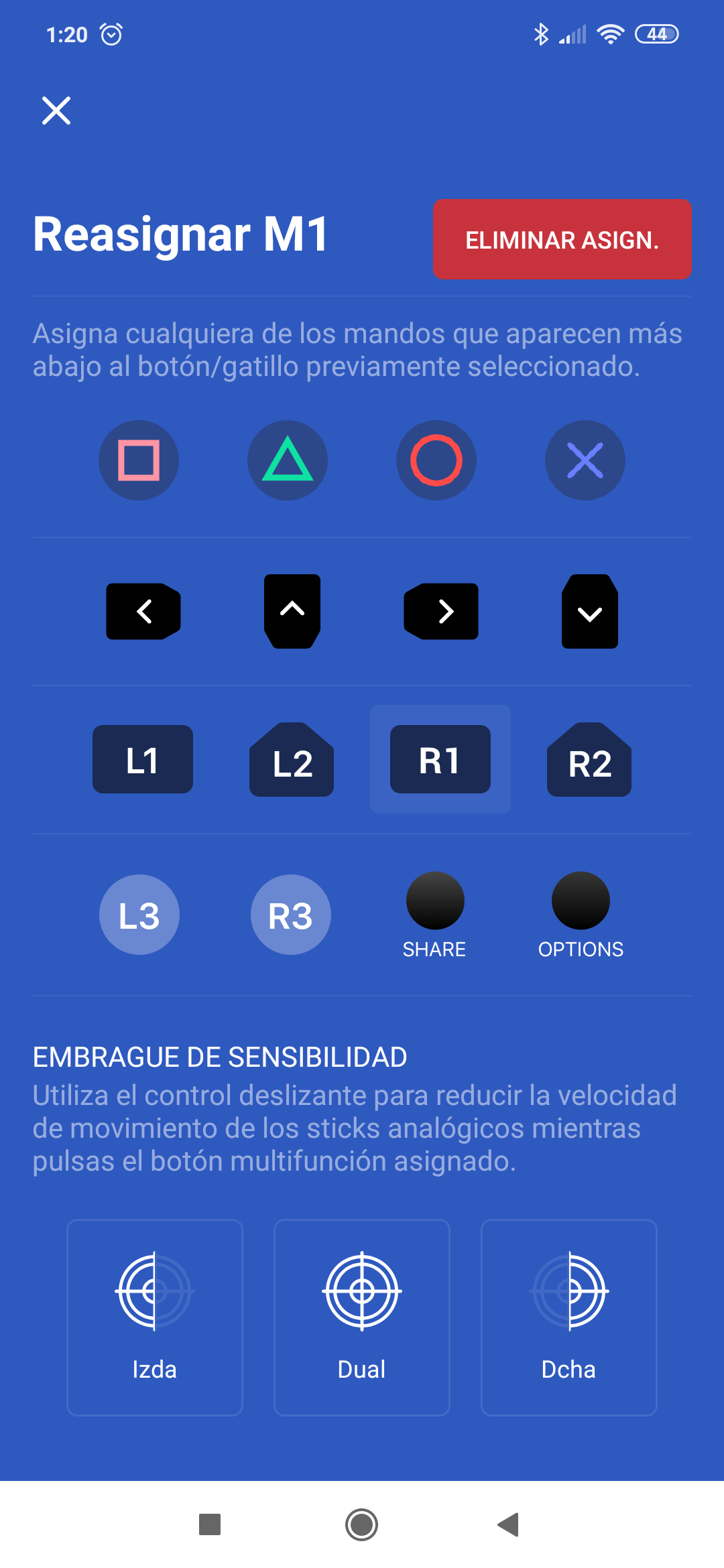 En los botones personalizables podemos asignar cualquier otro botón del mando (excepto el touchpad y botón PS), y teniendo en cuenta que tenemos 4, se pueden ajustar bastante bien según a lo que estemos jugando. También hay una función especial que es el embrague de sensibilidad mediante el cual podemos hacer que, uno de los joysticks o ambos, vaya más lento mientras pulsamos este botón. Esta última función va especialmente bien, por ejemplo, en shooters donde hay diferentes mirillas y no tenemos ajustes de sensibilidad para cada una.