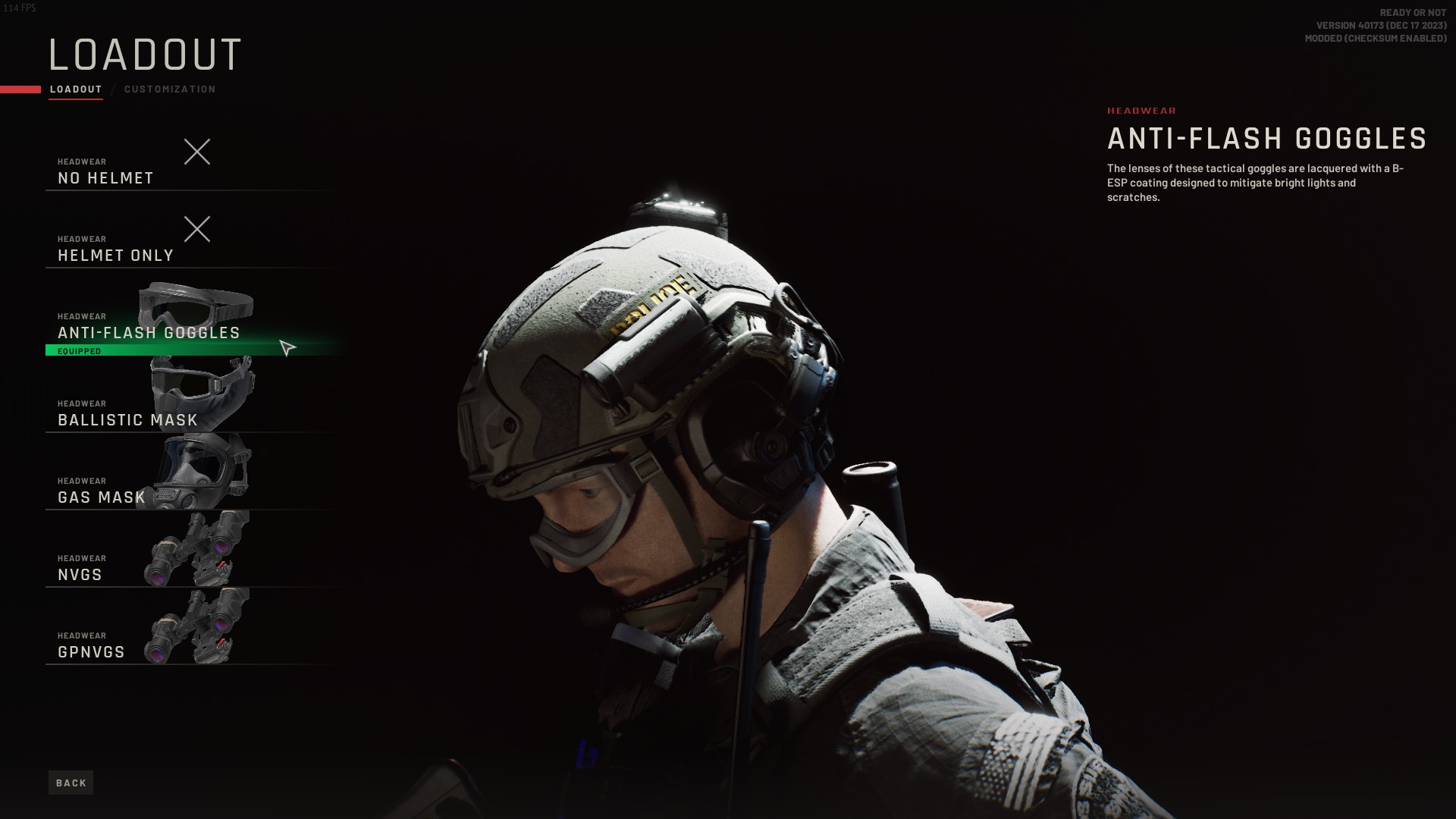 Contamos para elegir entre 14 fusiles de asalto, 10 subfusiles, 5 escopetas, y 8 pistolas, cada uno con varias opciones para modificar la mira, la boquilla, la empuñadura, y el accesorio bajo cañón. También contamos con equipamiento especial como granadas aturdidoras, de gas, taser, lanzagranadas, escudo táctico, entre otros.