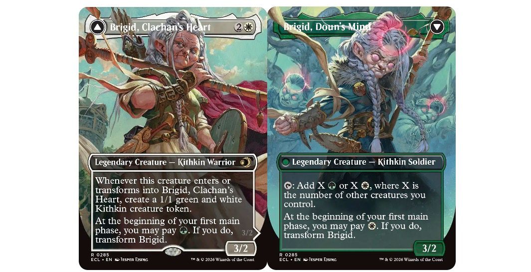 - Cartas de dos caras. Este tipo de cartas representan la naturaleza transformadora de Lorwyn y Páramo Sombrío al revelar un aspecto diferente de estos personajes en cada cara mientras recorren las diferentes facetas del plano. Todas las cartas de dos caras de esta colección son lo que se conoce como cartas de dos caras no modales, antes llamadas cartas de dos caras que se transforman. Esto significa que, a diferencia de algunas cartas de dos caras, no tienen costes de maná en sus caras posteriores y cuando las lanzas, solo puedes lanzar sus caras frontales.