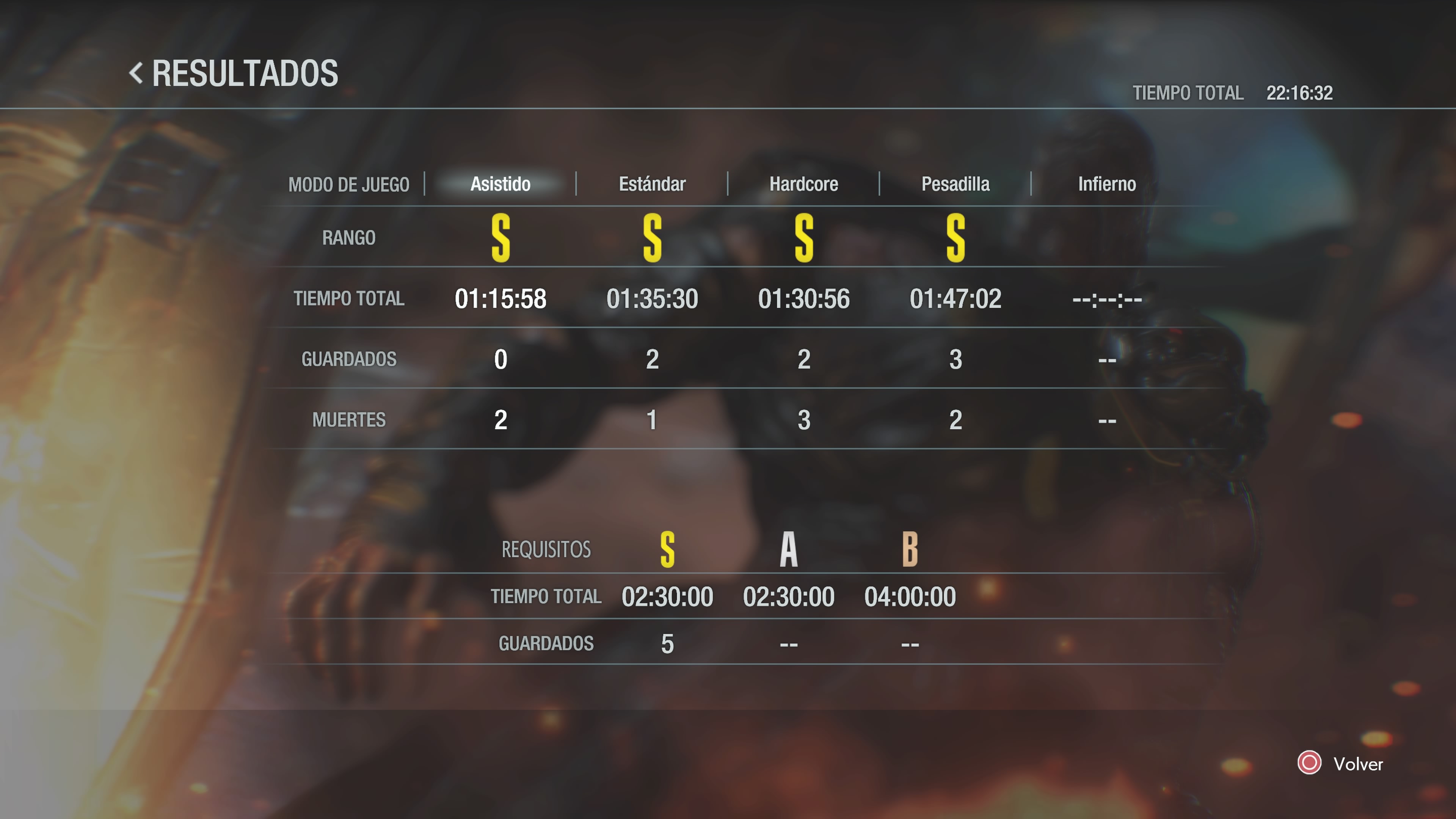 - Conseguir rango S: aunque esto me haya enfadado un poco, siempre queda conseguir el mejor rango en el juego. El cabreo en sí es porque ahora los objetos especiales no penalizan, solo los guardados y el tiempo. Es decir, puedes completar pesadilla con el lanzacohetes y sacar una S, aunque el juego pierde toda la gracia.
