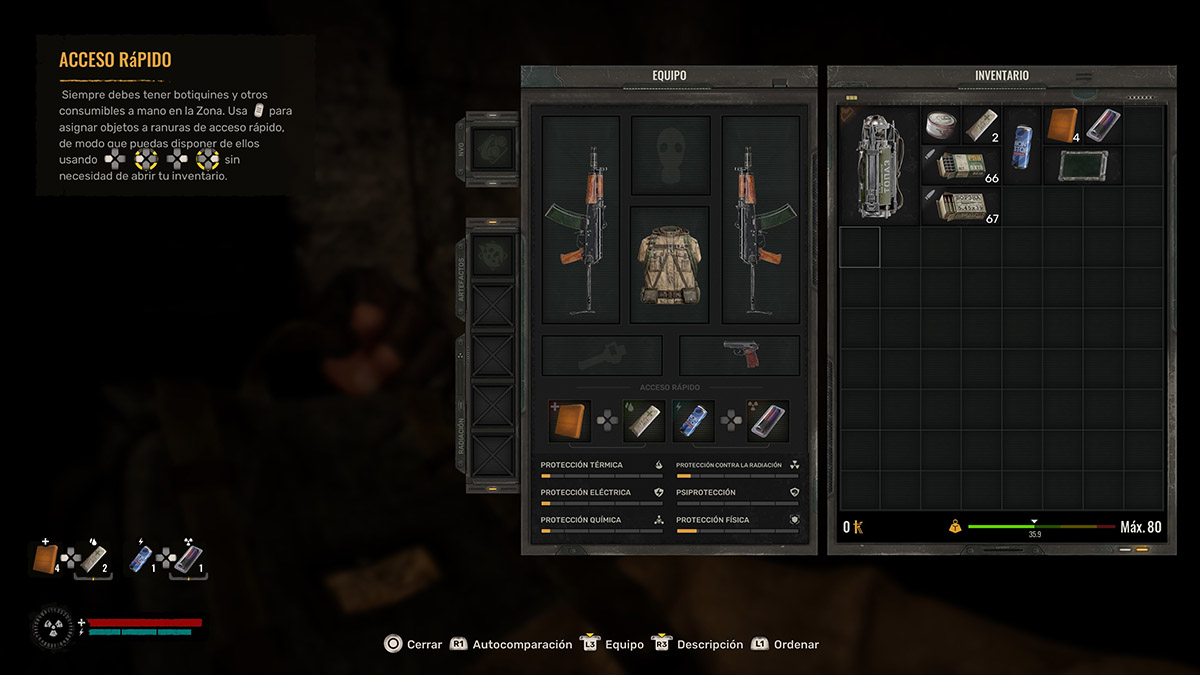 Y por supuesto, deberemos estar al tanto del nivel de radiación en todo momento, ya que siempre es fatal, y reducirá nuestra salud en un momento si no somos cuidadosos en las zonas de alta radiación. Por suerte, un buen sorbo de nuestro confiable vodka nos bajará los niveles de radiación, así que siempre es bueno llevar muchos encima.