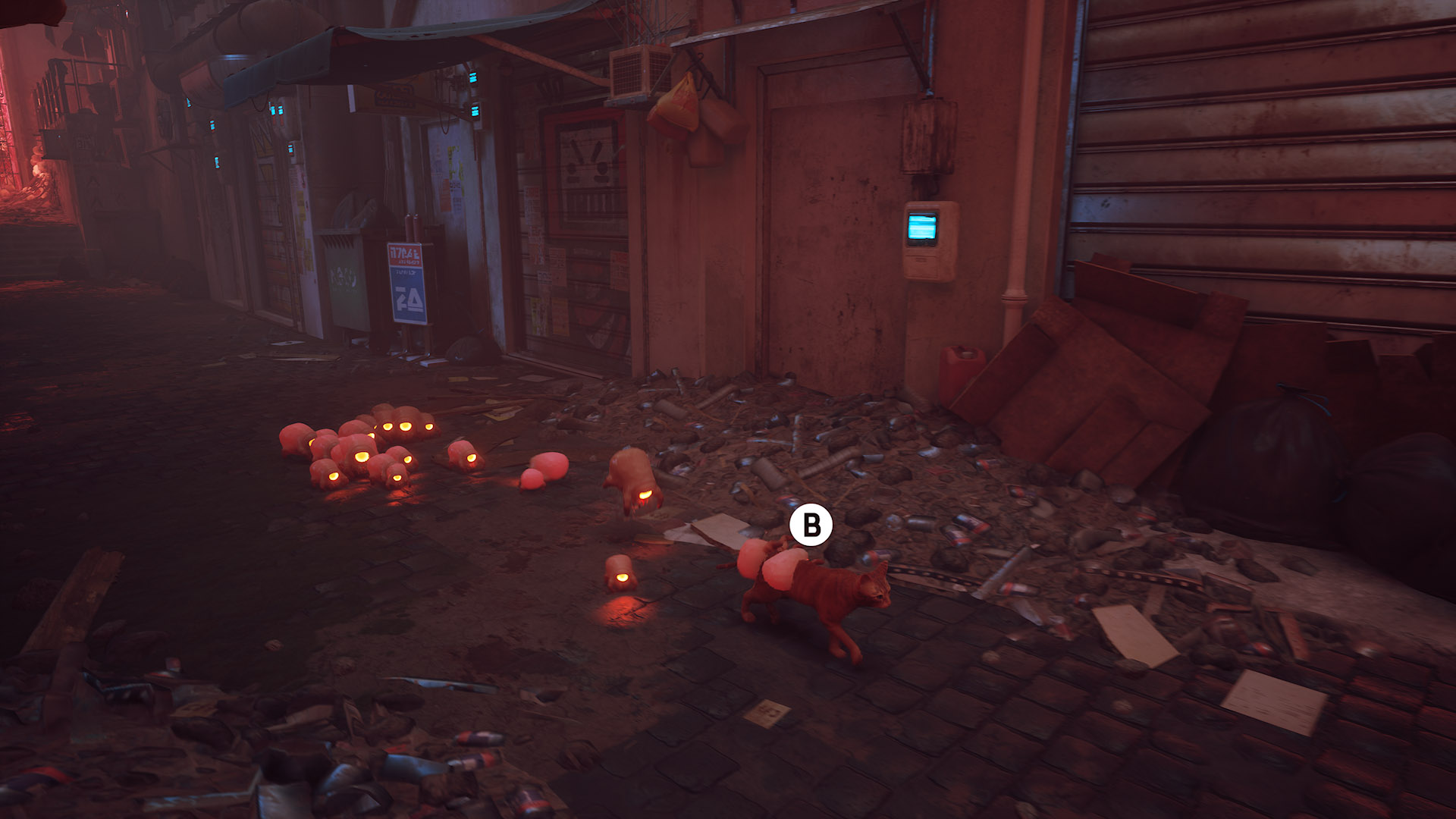 Stray no se destaca por solo es manejar al protagonista gatuno a través de una ciudad llena de alturas, durante el periplo de vuelta a casa deberemos superar una serie de acertijos, ya sea por nuestra cuenta o con la ayuda de B12, que también nos apoyará con algunos de sus recursos; una linterna para iluminar zonas o un rayo para acabar con los Zurks de ciertas zonas.