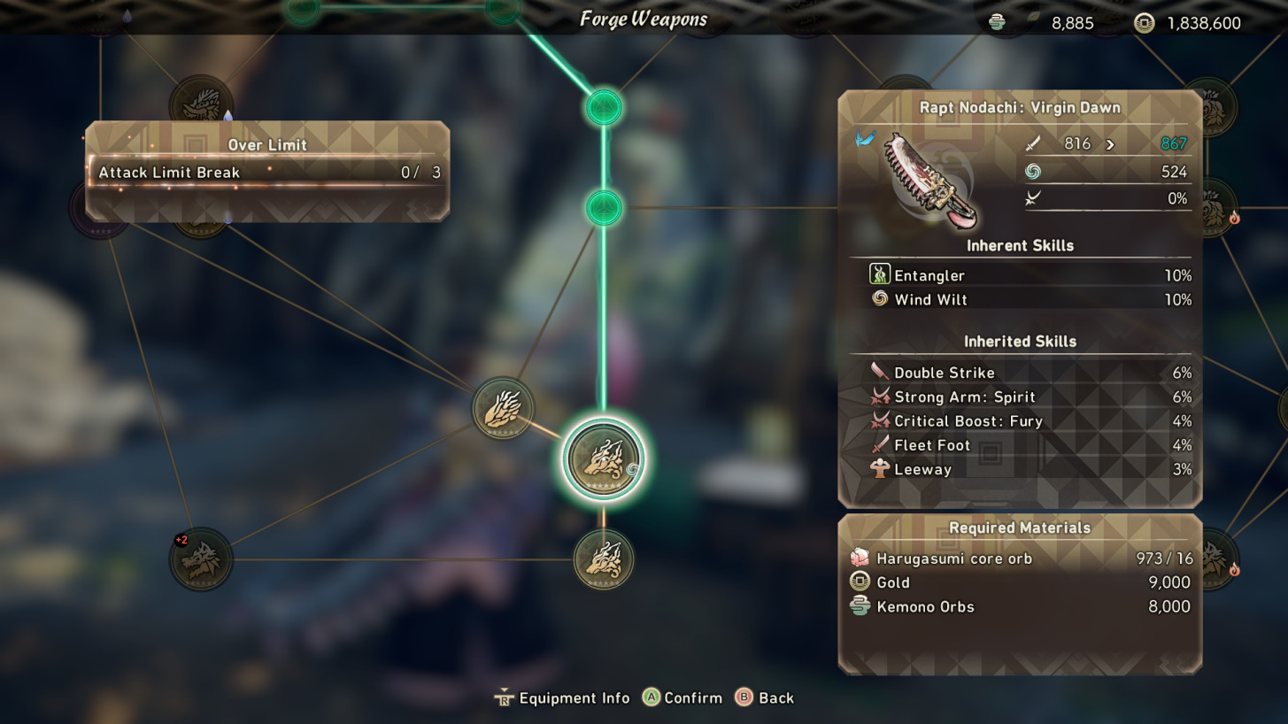 Los cazadores pueden luchar contra esta bestia con el nuevo Karakuri peonza. La peonza, que gana velocidad y potencia al chocar con cada obstáculo, se acerca para asestar un golpe eficaz e incluso hacer tambalearse a un Kemono atacante. Esta actualización también incluye la incorporación del nuevo sistema de sobrelímite, permitiendo a los cazadores usar Orbes esenciales, que pueden obtenerse a través de cacerías de Kemono en las que hayan triunfado, para mejorar sus armas y armaduras actuales.