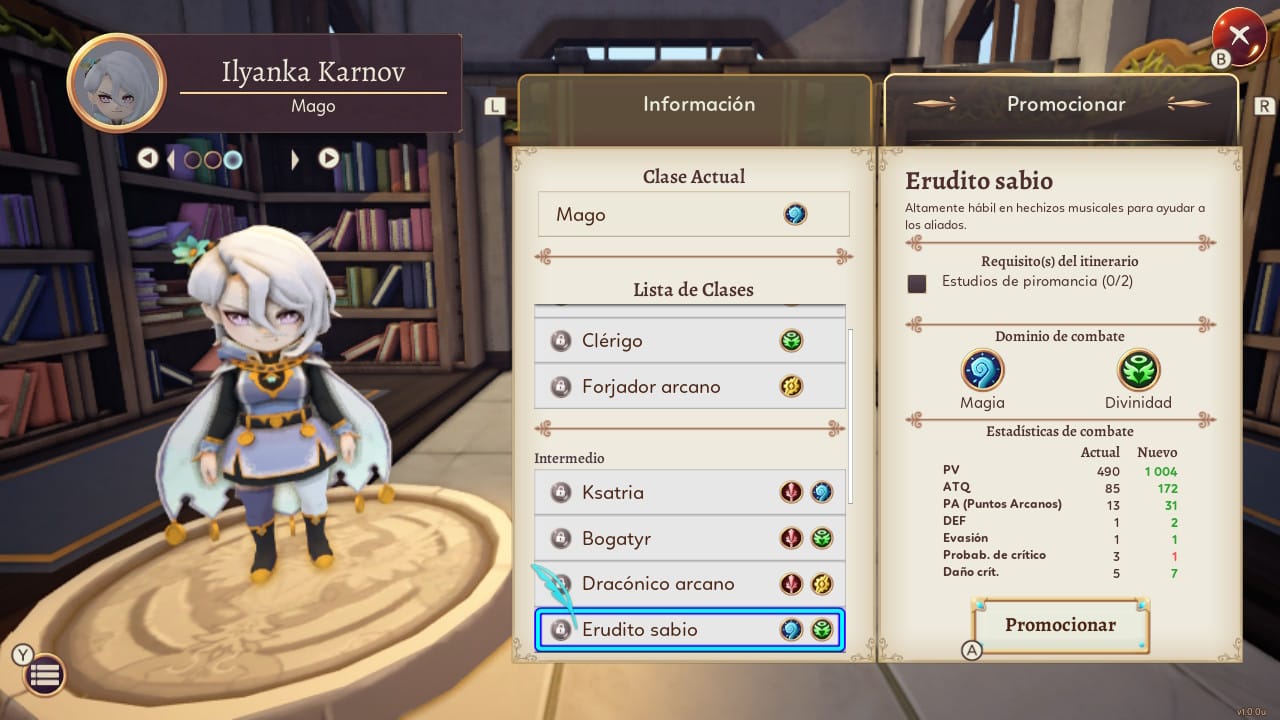 Además, en relación con lo anterior, aquí podemos ver qué edificios necesitan para poder seguir avanzando con sus estudios. También existe otro apartado donde podemos ver su información general (nivel, vida, ataque…) y nos permite (si cumple los requisitos) promocionarle a una nueva categoría.