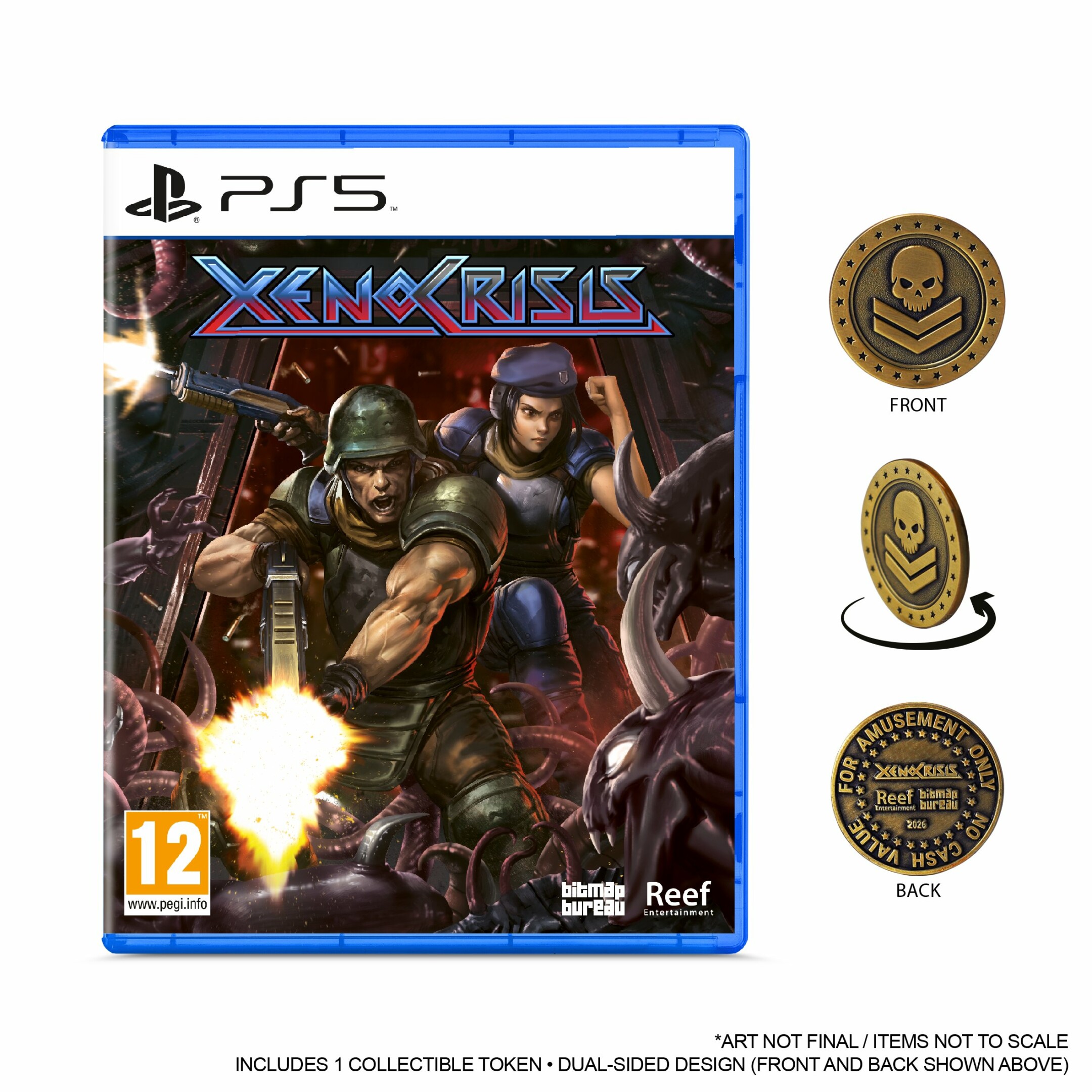 Los fans que busquen un bonus físico adicional pueden dirigirse a la Bitmap Bureau Store para recibir una ficha arcade exclusiva, ¡perfecta para coleccionistas! Esta ficha se incluye con cualquier edición física de Xeno Crisis comprada en la Bitmap Bureau Store y es la última incorporación a un conjunto en crecimiento para los fans veteranos de Bitmap Bureau, muchos de los cuales ya han coleccionado anteriormente la moneda de Terminator 2D: NO FATE. Además, todas las ediciones físicas también incluyen un manual del juego impreso y una funda de portada reversible.